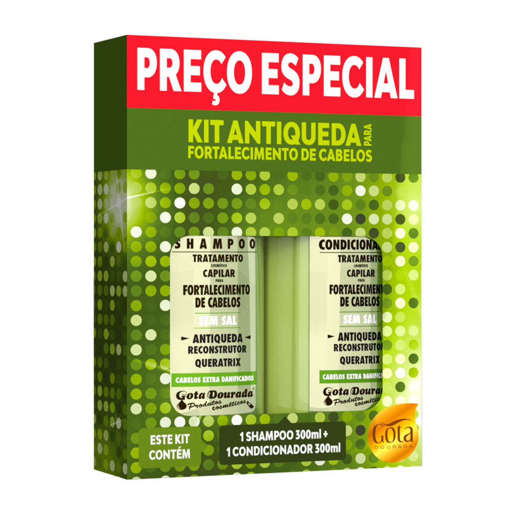 O Kit Antiqueda Gota Dourada Shampoo 300ml + Condicionador 300ml é ideal para quem sofre com a queda capilar e precisa de um tratamento eficaz para fortalecer os fios. Com a poderosa combinação do Queratrix (Queratina + Creatina), este kit age profundamente nos cabelos, combatendo a queda e reparando os danos causados por alisamentos, tintura e escovas. A fórmula especial penetra na estrutura capilar, proporcionando resistência, brilho e suavidade, além de reconstruir até os fios mais danificados.