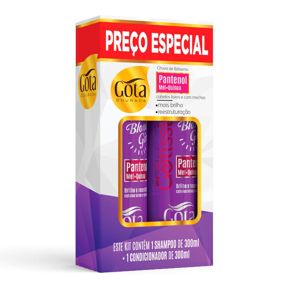 O Kit Gotissima Chuva de Balsamo Gota Dourada Shampoo 300ml + Condicionador 300ml foi desenvolvido especialmente para cabelos loiros e com mechas. Com uma fórmula rica em Pantenol, Mel, Quinoa e Bálsamo, ele proporciona hidratação profunda, reconstrução dos fios e um brilho intenso. Se você busca cabelos mais saudáveis, revitalizados e cheios de vida, este kit é a escolha ideal.
