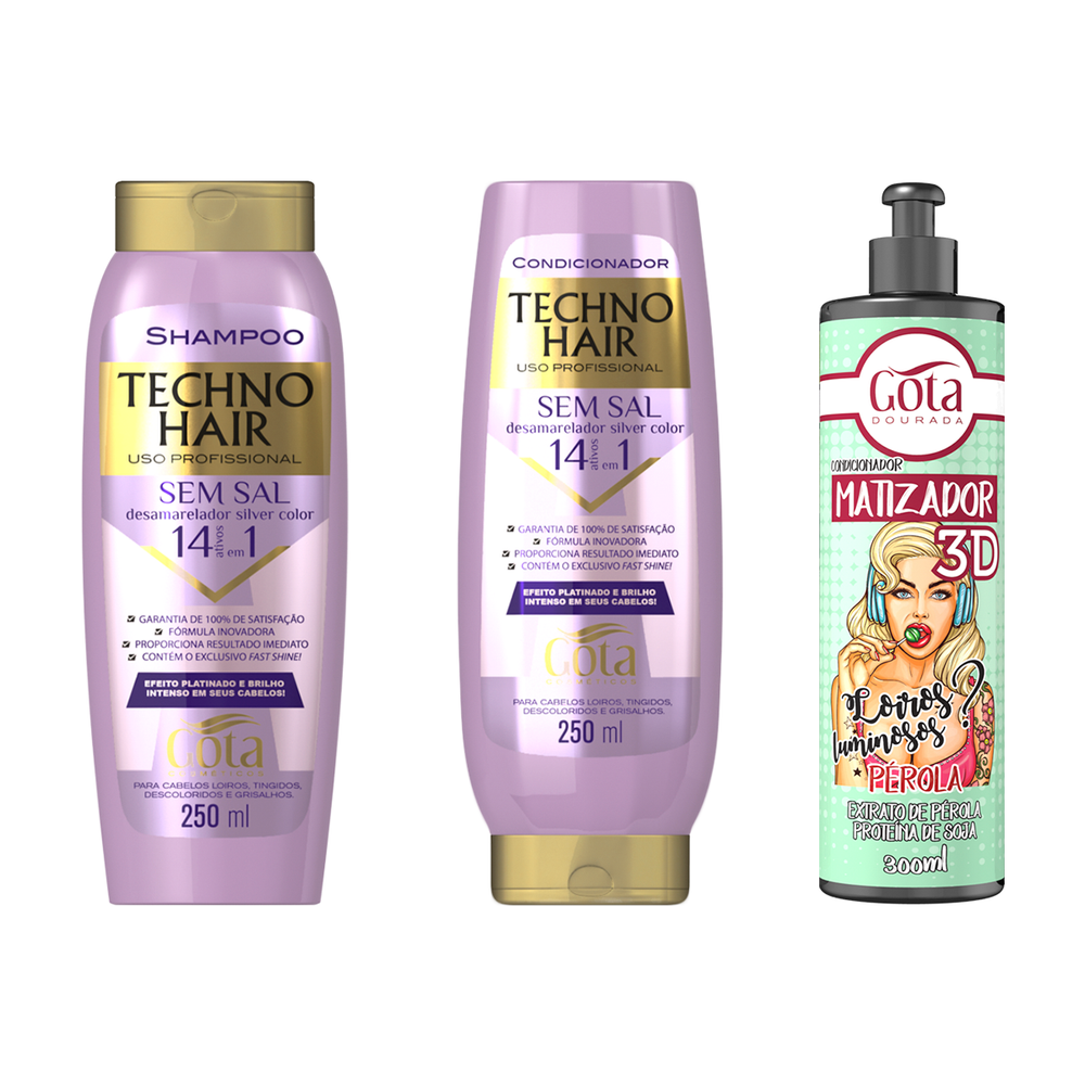 Tratamento completo e profissional para neutralizar o amarelado, intensificar o brilho e restaurar a saúde dos fios loiros, descoloridos ou grisalhos. O Kit Techno Hair 14x1 Gota Dourada combina a ação do Shampoo e Condicionador Silver Color com o Condicionador Matizador Pérola, proporcionando uma matização eficaz, hidratação profunda e fortalecimento dos fios em um único ritual de beleza.