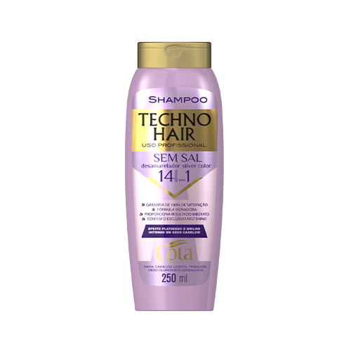 O Kit Techno Hair 14x1 Silver Color Gota Dourada — composto por Shampoo, Condicionador e Creme de Tratamento — foi especialmente desenvolvido para neutralizar o amarelado indesejado e realçar o brilho platinado dos cabelos claros, descoloridos ou grisalhos. Com pigmentos violeta e ativos reconstrutores, ele limpa, hidrata e protege os fios em todas as etapas do cuidado.